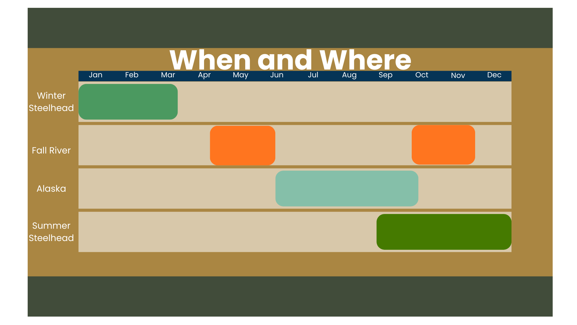 Chrome, redwoods, and rain! I guide most major rivers in Humboldt, Del Norte, Mendocino, and Sonoma counties. Weather is the ultimate decider of a steelhead trip’s fate; these trips often require a bit of extra driving and some planning on short notice. Steelhead rivers commonly blow out throughout the season, so refunds and rescheduling are always an option. However, I am proud to offer new access to a little-known blowout-resistant steelhead fishery that almost guarantees your ability to fish on the original booking day, just maybe with a bit more saltwater than the average day in the redwoods… Ask about Oregon, Prince of Wales, and Stillwater options!